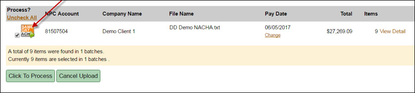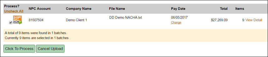 After you have selected your file, click the “Click to Upload” button. If the deposit date in your file already reflects the current date you will be taken to the review screen where your batch will be marked as Same-Day ACH (if you have uploaded your file prior to 1 p.m. EST).