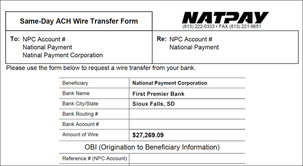 PLEASE NOTE: Same-Day ACH wires go to a different bank than our normal wires. Be sure to send the wire to bank account listed on the form you download from the My.DirectDeposit.com. In order to avoid delays in NatPay receiving your wire, please be sure to list NatPay as the beneficiary, and put your client’s NPC Account number in the memo field.